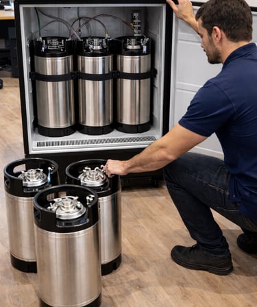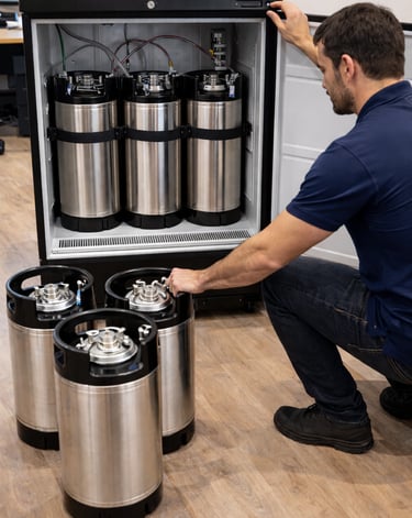 Dažniausiai pakanka vieno įrengimo - šaldytuvo su stovu, CO2 balionu ir trimis kranais. Iš Jūsų pusės tereikia skirti jam vietos (išmatavimai apie 60x60cm). Mes pasirūpinsime viskuo kitu - pristatymu, pajungimu, paleidimu.